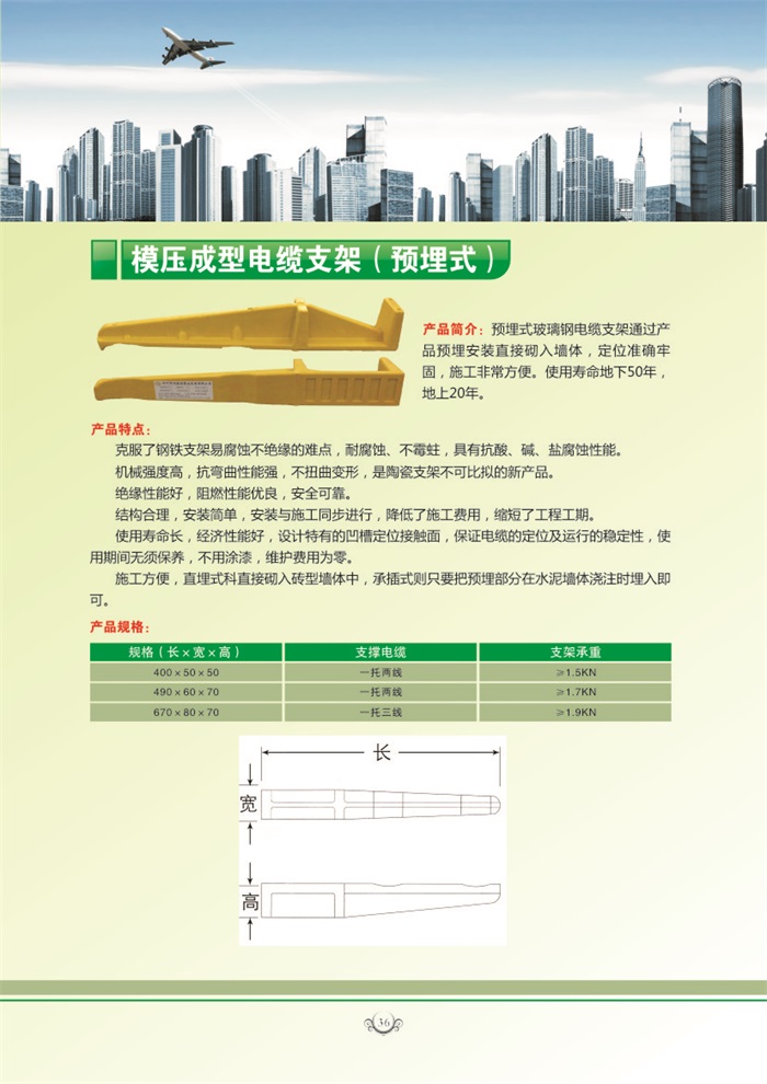 預埋式玻璃鋼電纜支架通過產(chǎn)品預埋安裝直接砌入墻體,定位準確牢固,施工非常方便。使用壽命地下50年,地上20年