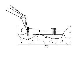 2.7對直徑小于1500mm的管道,可通過能跨地溝的挖掘機(jī)來插接。即在承口前面放置一塊或若干塊相當(dāng)?shù)哪举|(zhì)墊板保護(hù)管道端面,以防被挖掘機(jī)吊頭碰傷。然后旋轉(zhuǎn)吊頭使其緊貼墊板并推動管道使承插口連接。(見圖9)