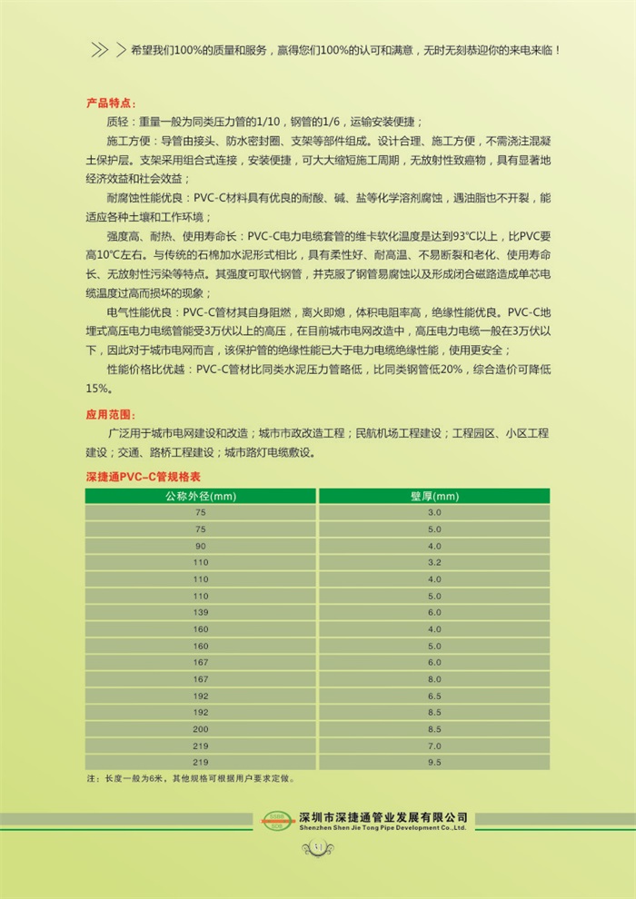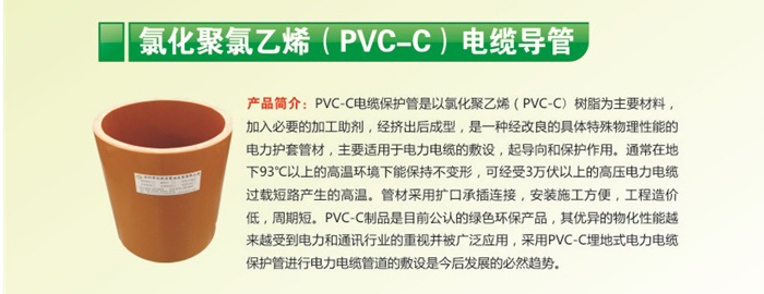 PVC-C電纜保護管是以氯化聚乙烯(PVC-C)樹脂為主要材料,加入必要的加工助劑,經(jīng)擠出后成型,是一種經(jīng)改良的具體特殊物理性能的電力護套管材,主要適用于電力電纜的敷設,起導向和保護作用。通常在地下93℃以上的高溫環(huán)境下能保持不變形,可經(jīng)受3萬伏以上的高壓電力電纜過載短路產(chǎn)生的高溫。管材采用擴口承插連接,安裝施工方便,工程造價低,周期短。PVC-C制品是目前公認的綠色環(huán)保產(chǎn)品,其優(yōu)異的物化性能越來越受到電力和通訊行業(yè)的重視井被廣泛應用。采用PVC-C埋地式電力電纜保護管進行電力電纜管道的敷設是今后發(fā)展的必然趨勢