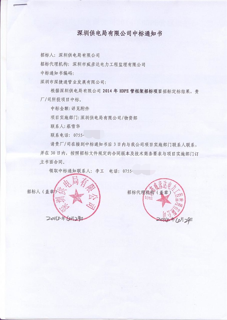 熱烈祝賀深捷通管業(yè)成為深圳供電局2014年HDPE管中標(biāo)單位!